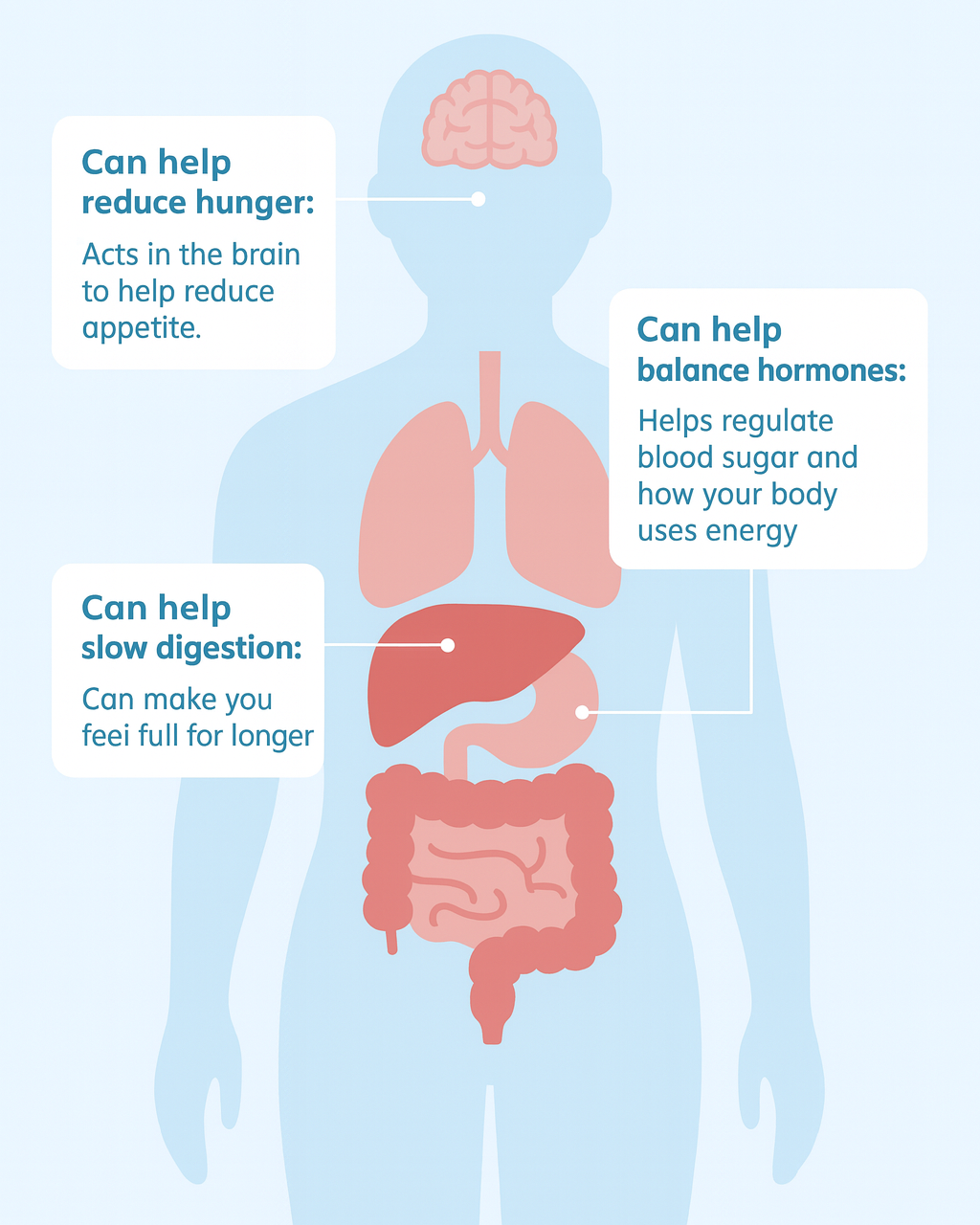 - Reduces appetite: Helps regulate hunger signals, making it easier to eat less.