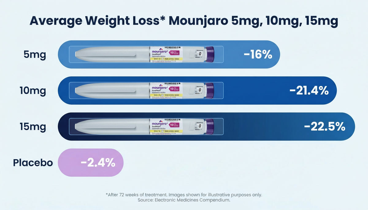 When using Mounjaro KwikPens to reduce appetite, patients typically lose between 16% and 22.5% of their starting body weight by the end of treatment. This makes Mounjaro the most effective GLP-1 medication currently available.
